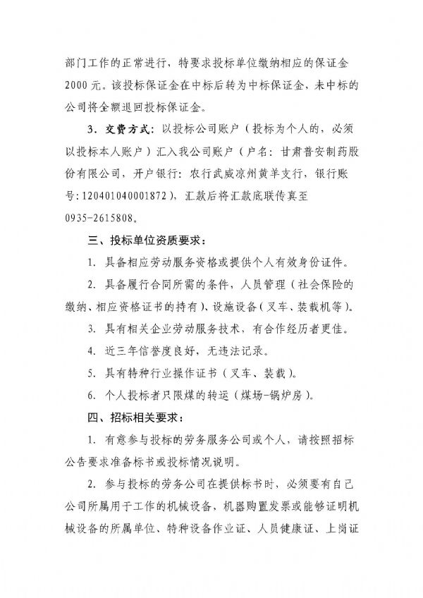 甘肅普安制藥股份有限公司裝卸業務招標公告