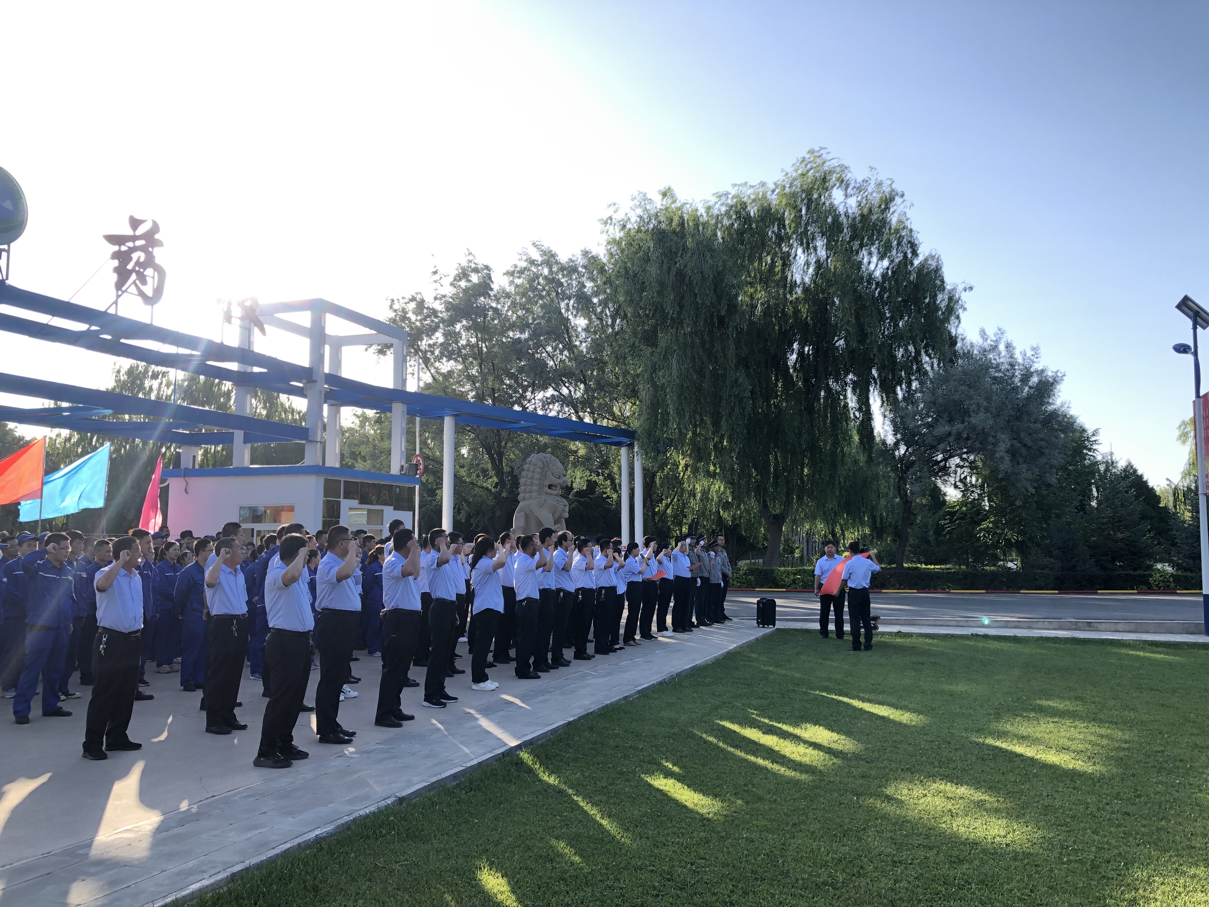 7月1日早7點15分,迎著初升的朝陽,甘肅普安制藥股份有限公司在廠區大門口前舉行了升國旗與重溫入黨誓詞儀式。