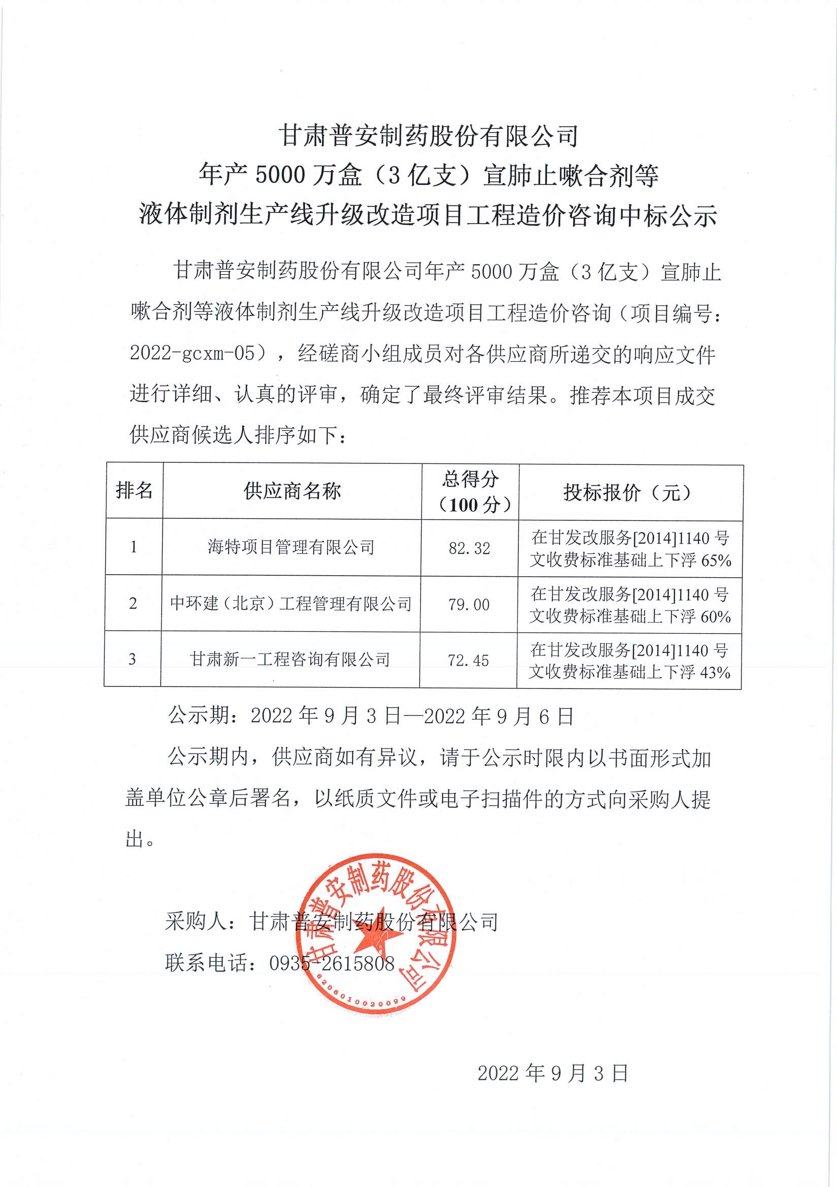 甘肅普安制藥股份有限公司年產(chǎn)5000萬盒(3億支)宣肺止嗽合劑等液體制劑生產(chǎn)線升級改造項目工程造價咨詢中標(biāo)公示
