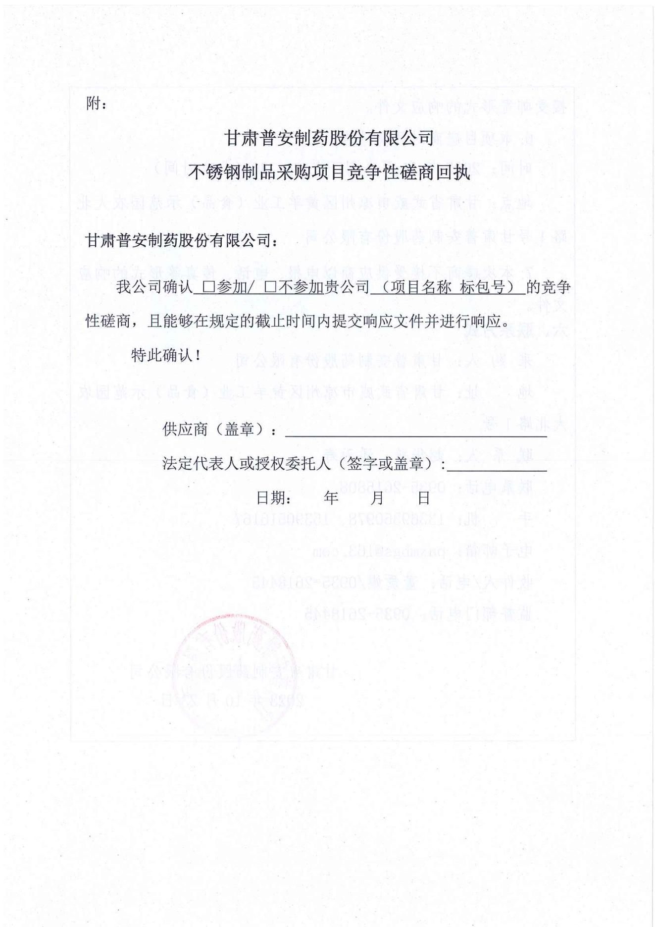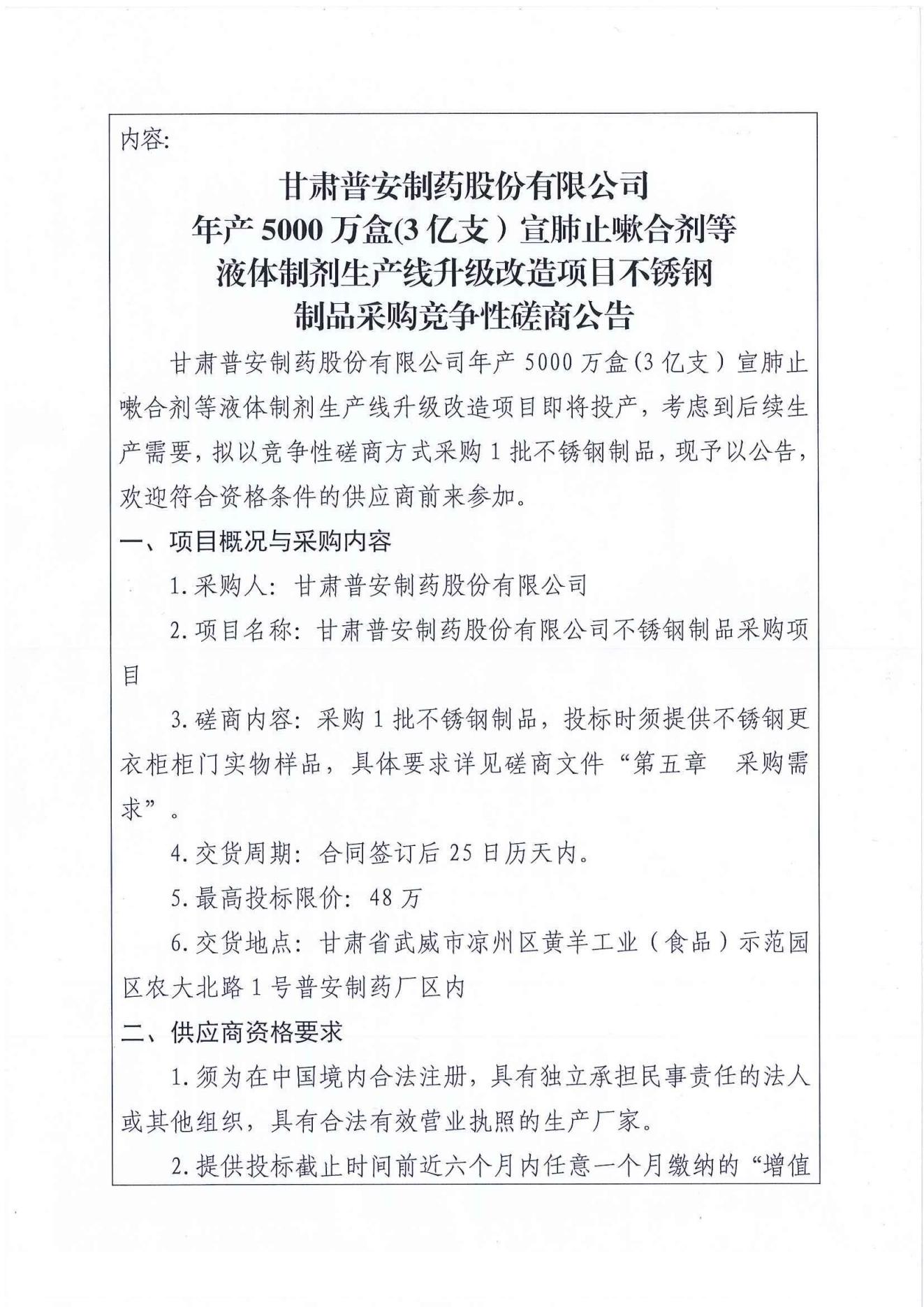 甘肅普安制藥股份有限公司年產5000萬盒(3億支)宣肺止嗽合劑等液體制劑生產線升級改造項目不銹鋼制品采購競爭性磋商公告