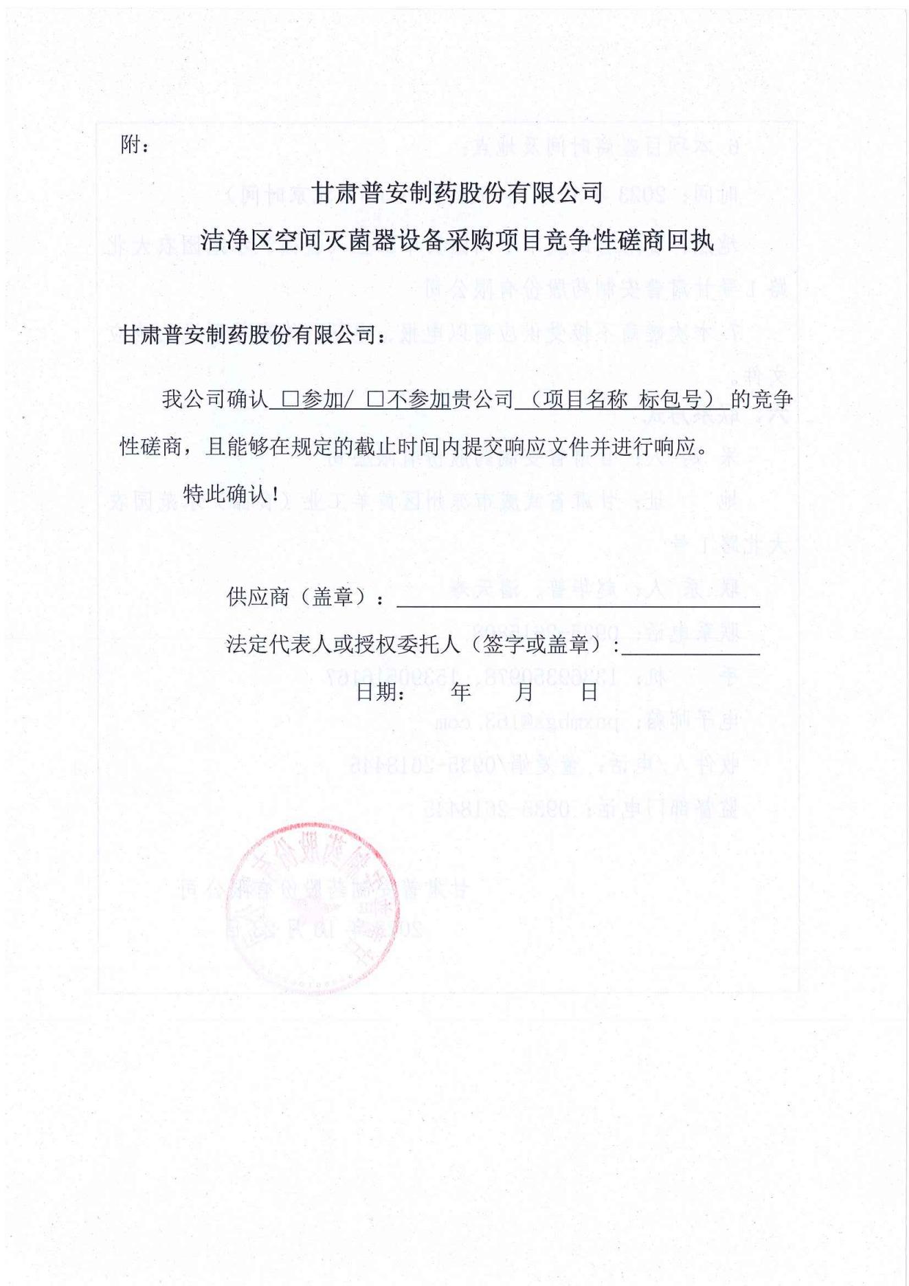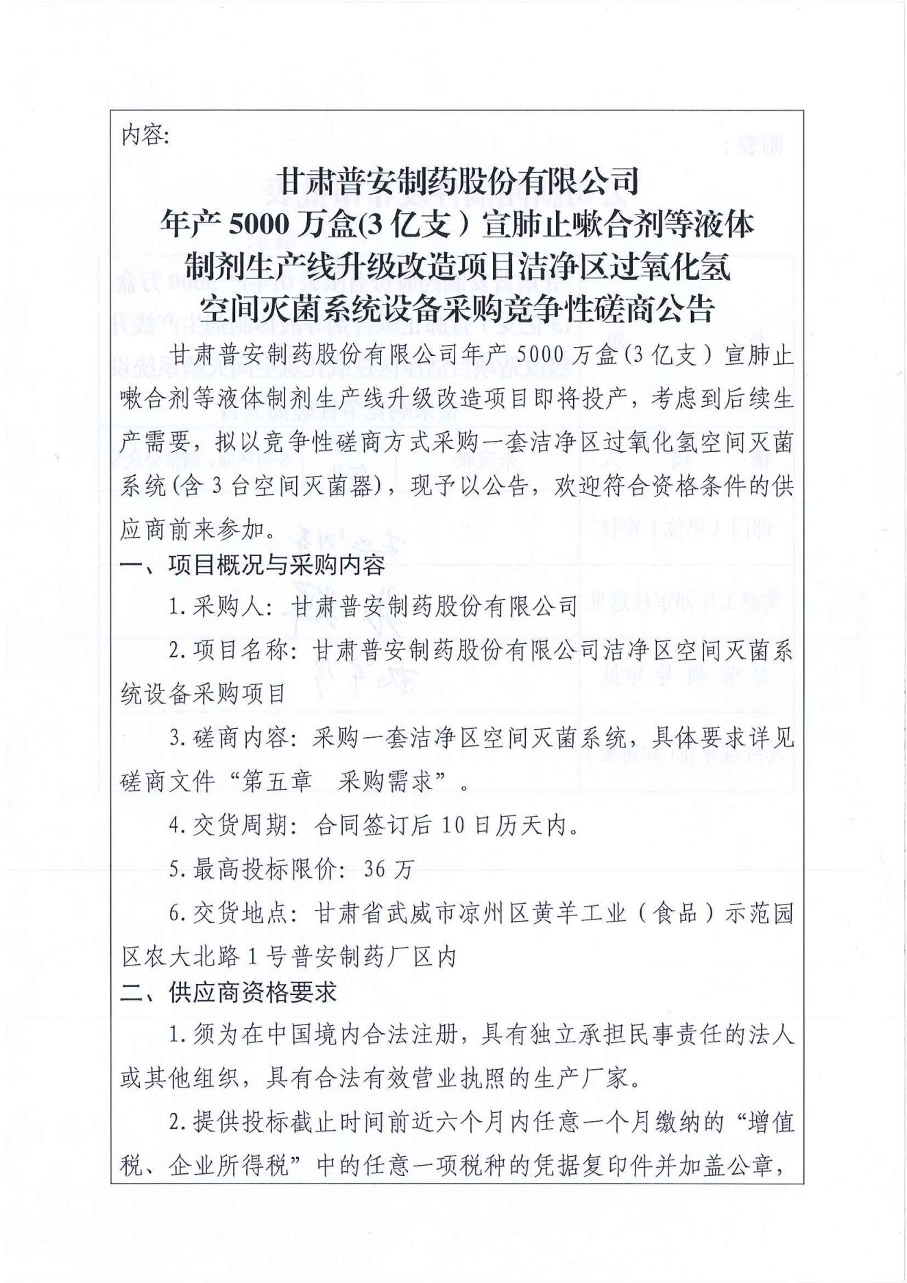 甘肅普安制藥股份有限公司年產(chǎn)5000 萬(wàn)盒(3億支)宣肺止嗽合劑等液體制劑生產(chǎn)線(xiàn)升級(jí)改造項(xiàng)目潔凈區(qū)過(guò)氧化氫空間滅菌系統(tǒng)設(shè)備采購(gòu)競(jìng)爭(zhēng)性磋商公告