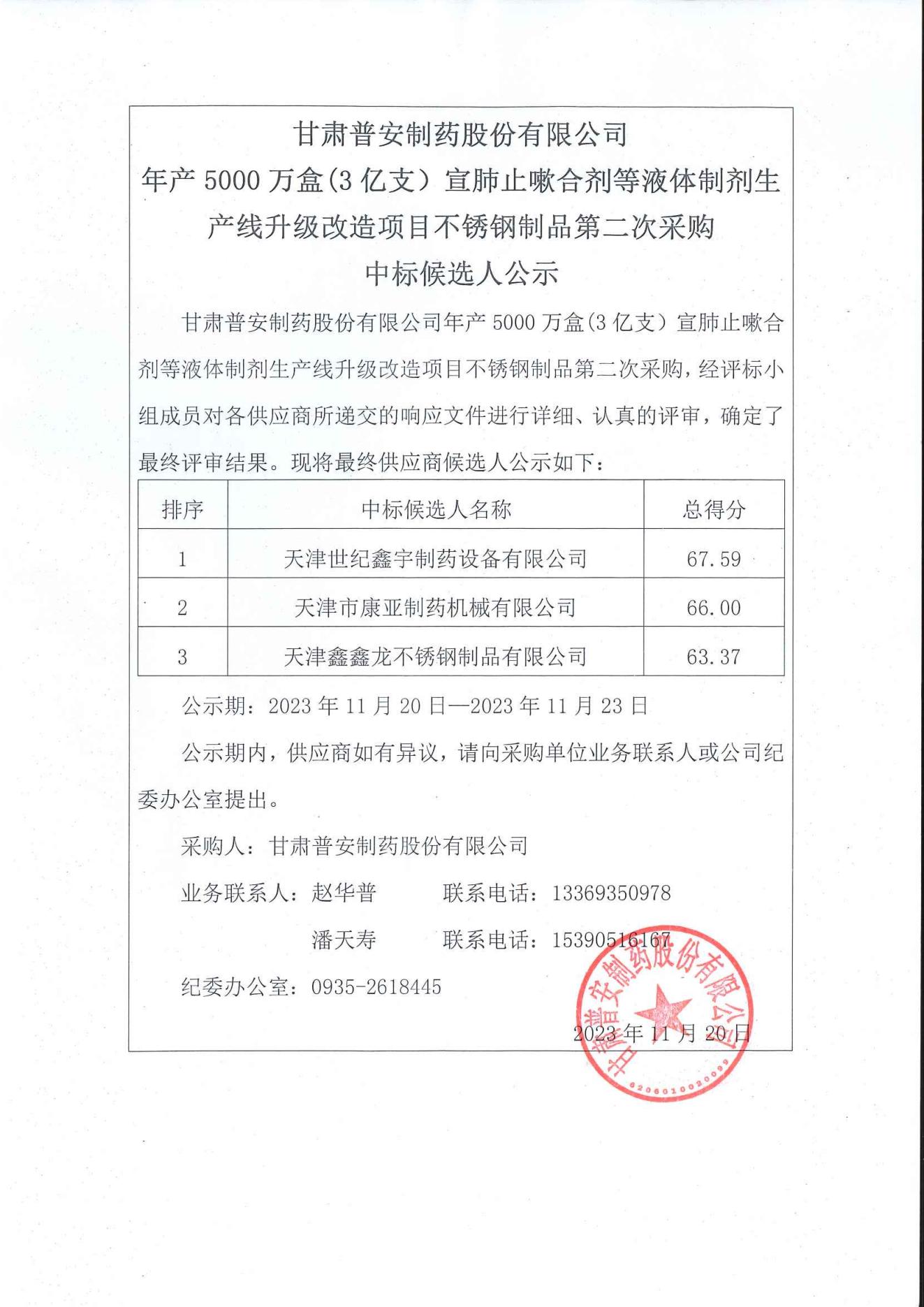 甘肅普安制藥股份有限公司年產(chǎn)5000萬盒(3 億支)宣肺止嗽合劑等液體制劑生產(chǎn)線升級改造項目不銹鋼制品第二次采購中標(biāo)候選人公示
