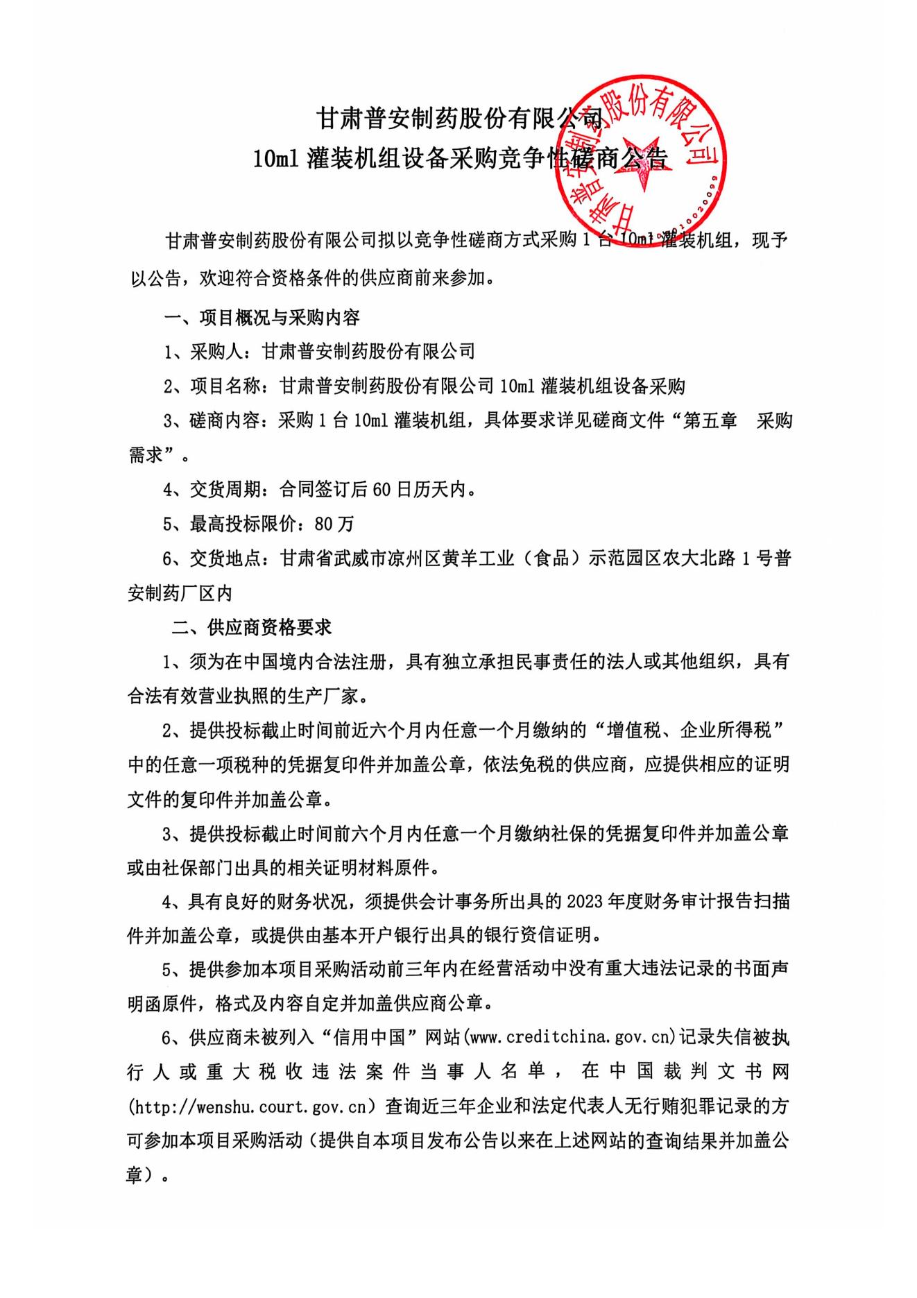 甘肅普安制藥股份有限公司10ml灌裝機(jī)組設(shè)備采購競爭性磋商公告