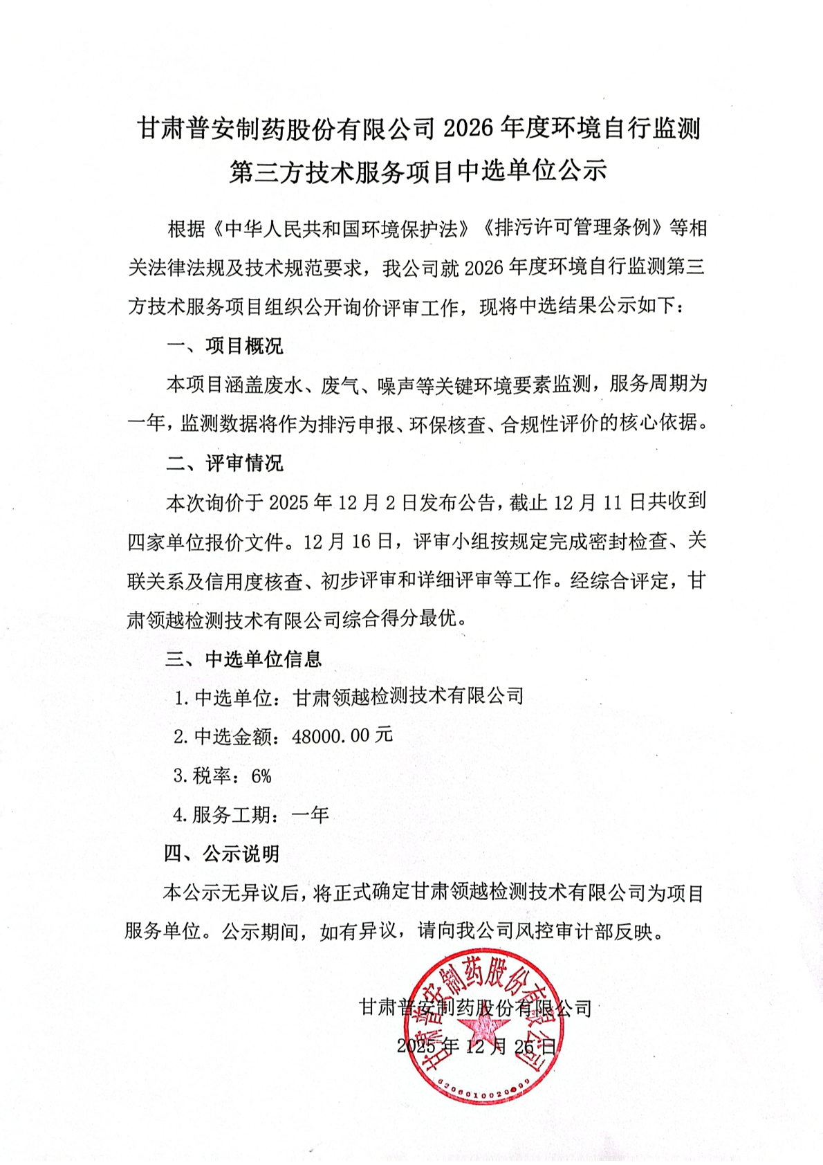 甘肅普安制藥股份有限公司2026年度環境自行監測第三方技術服務項目中選單位公示