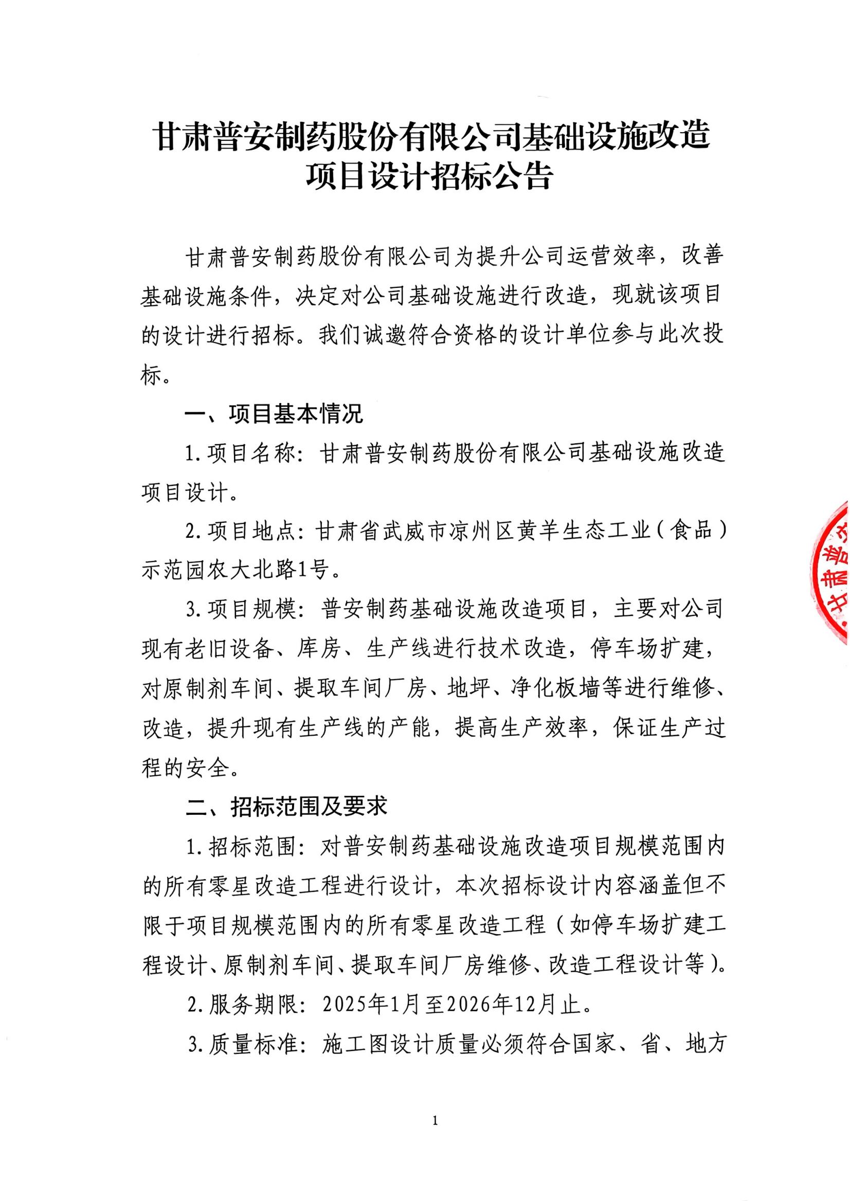 甘肅普安制藥股份有限公司基礎(chǔ)設(shè)施改造項目設(shè)計招標(biāo)公告