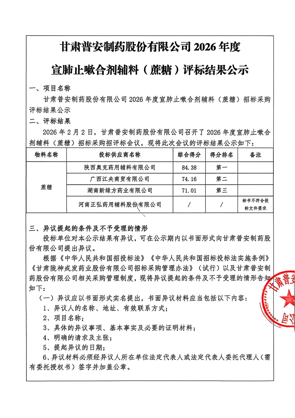 甘肅普安制藥股份有限公司2026年度 宣肺止嗽合劑輔料(蔗糖)評標結果公示